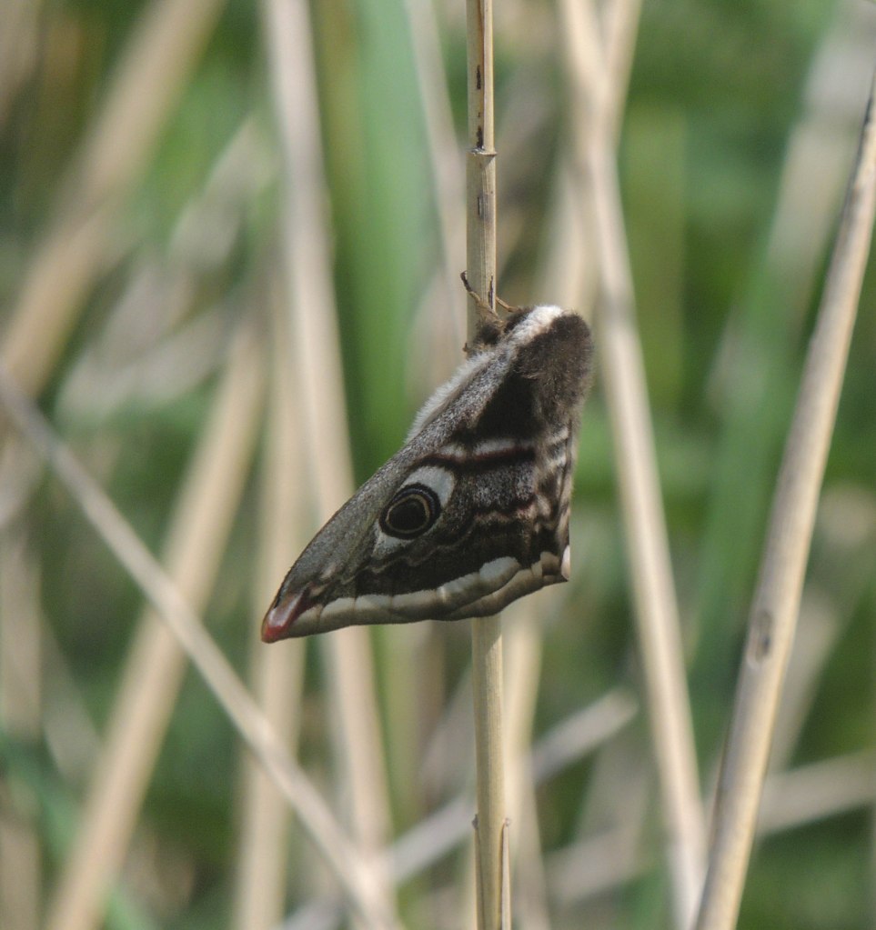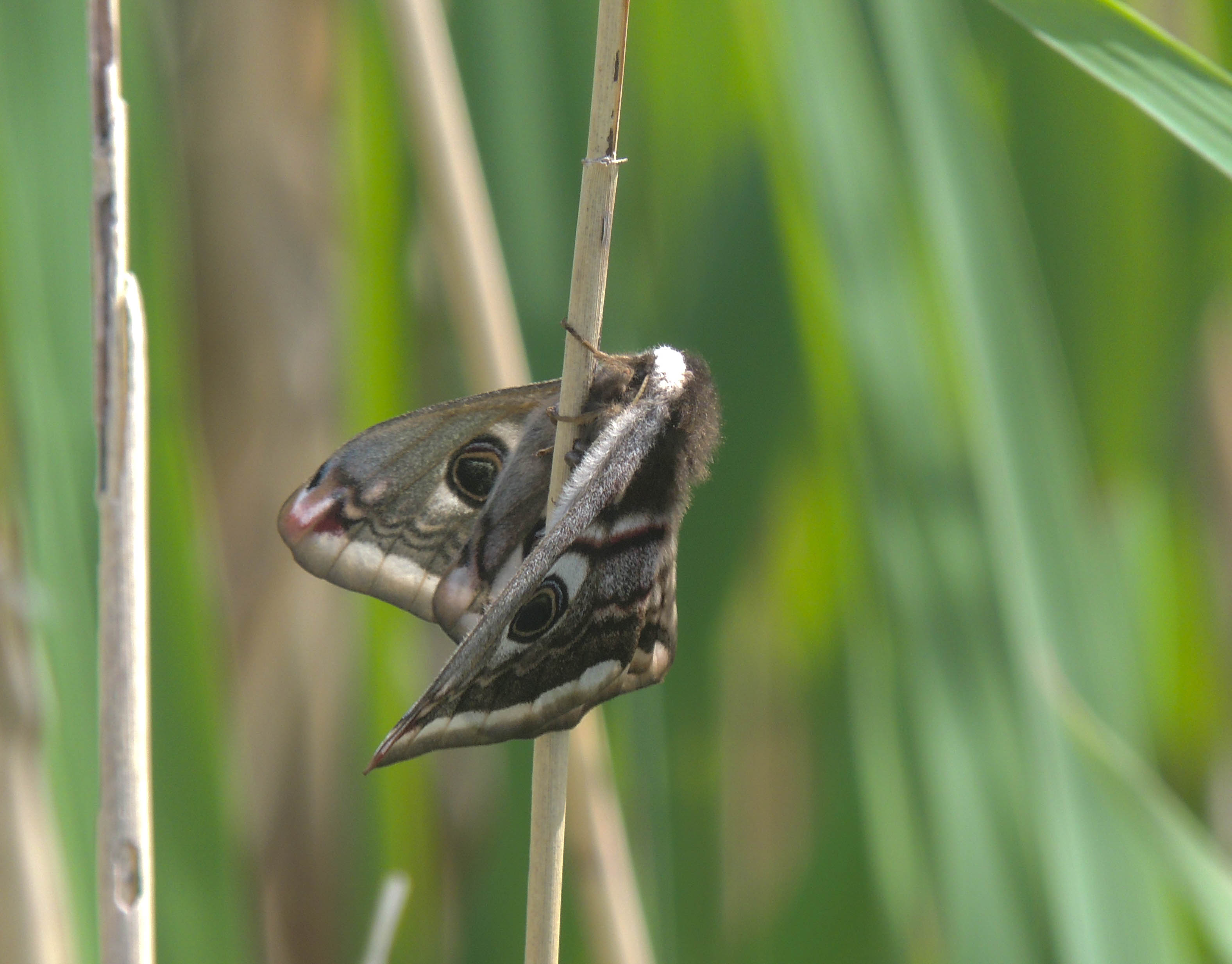 On the marsh were the usual variety of Wildfowl and Wetlands birds. A party of 8 Shelduck flew over and a Swallow, my first of the summer also passed overhead. Nicole spotted a large Moth on a reed stem, which turned out to be a female Emperor Moth.