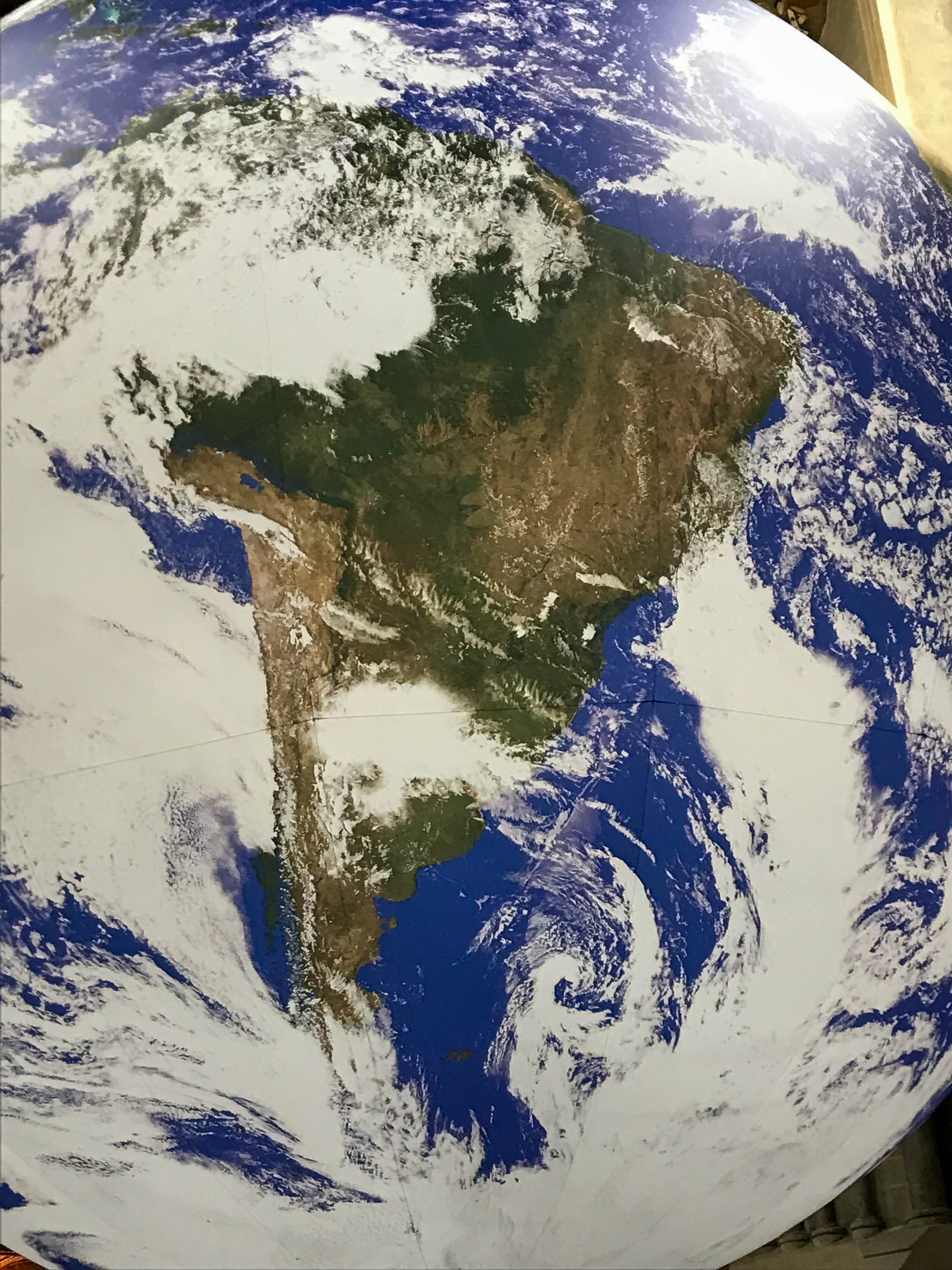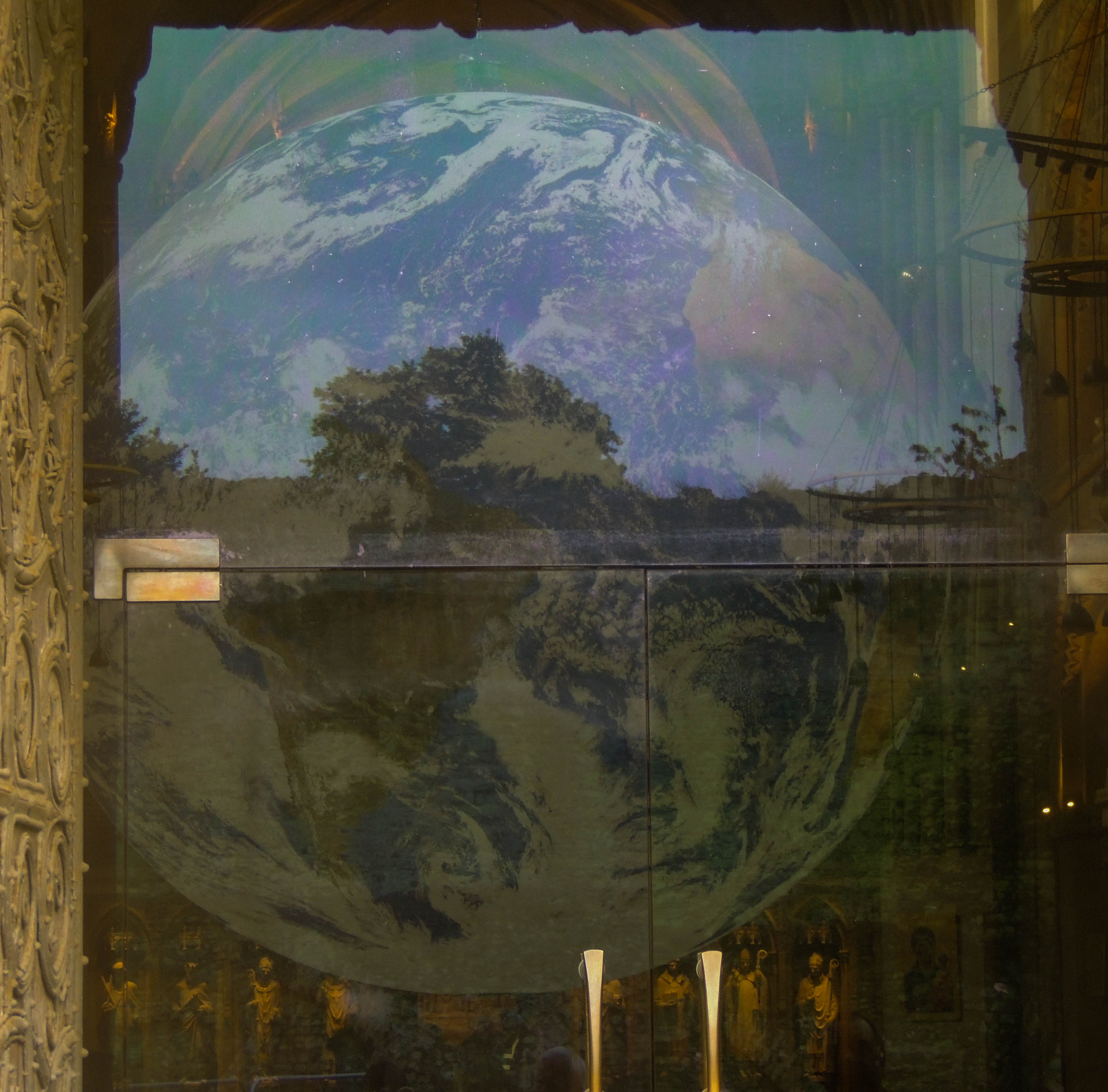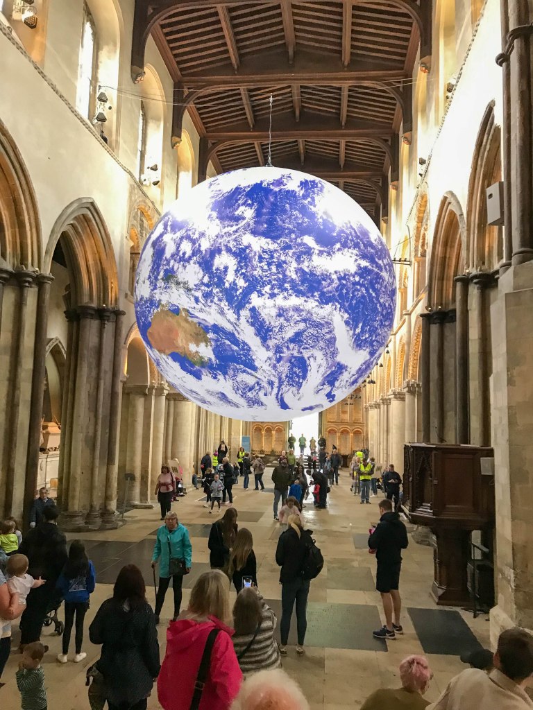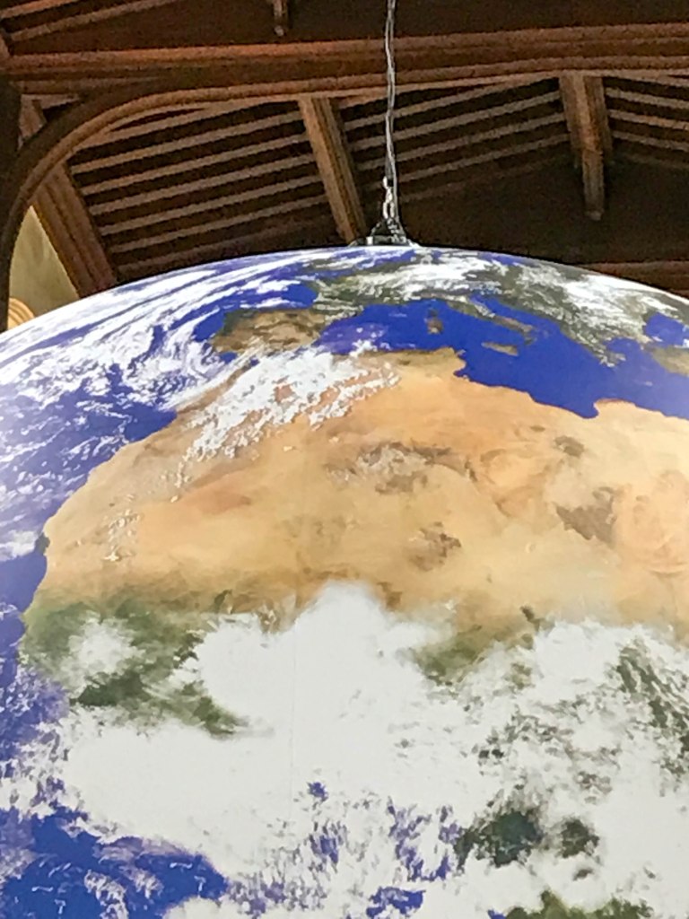 Yesterday I went to Rochester to meet Keith and we visited an exhibition called Gaia in the Cathedral. Gaia is a scale model of the Earth (1cm=18km). It hangs in the middle of the Cathedral nave. My first impression was just how much of the world is water, something I think I had never really appreciated from maps or small globes. Astronauts when they first saw the Earth from space described a feeling of awe, something that became known as the Overview effect and looking at this installation I can see what they mean.