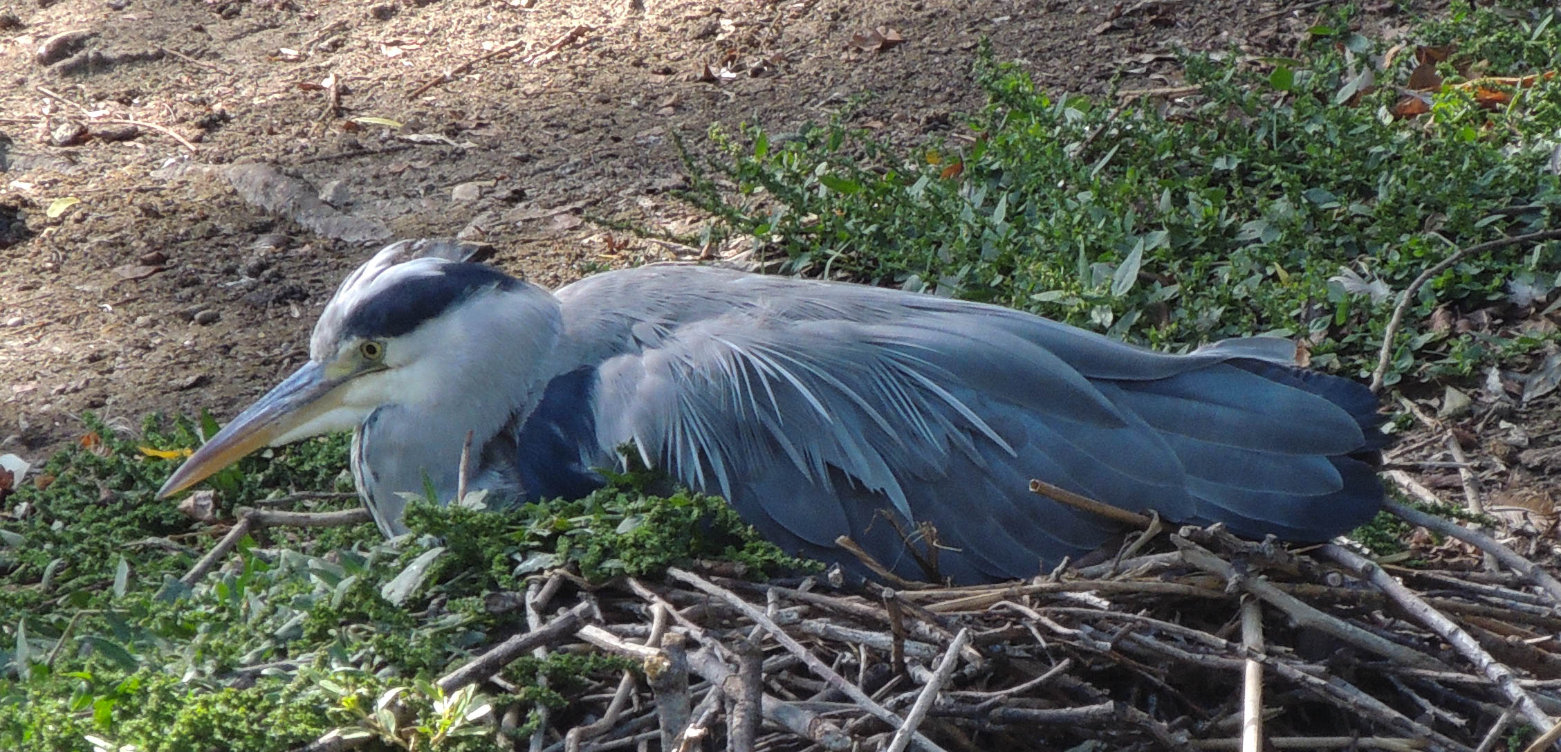 The usual residents were on the lake but there were few migrants visible, just a few Common Chiffchaffs. One odd thing I did see was a Grey Heron lying on the bank at the water’s edge. As I got closer it appeared to be sitting on, what looks like a nest. I have had a quick look on the internet and Herons have been recorded as ground-nesting, although usually, they nest in trees. But in these cases, it is usually in reed beds, not out in the open. So this is most strange behavior.