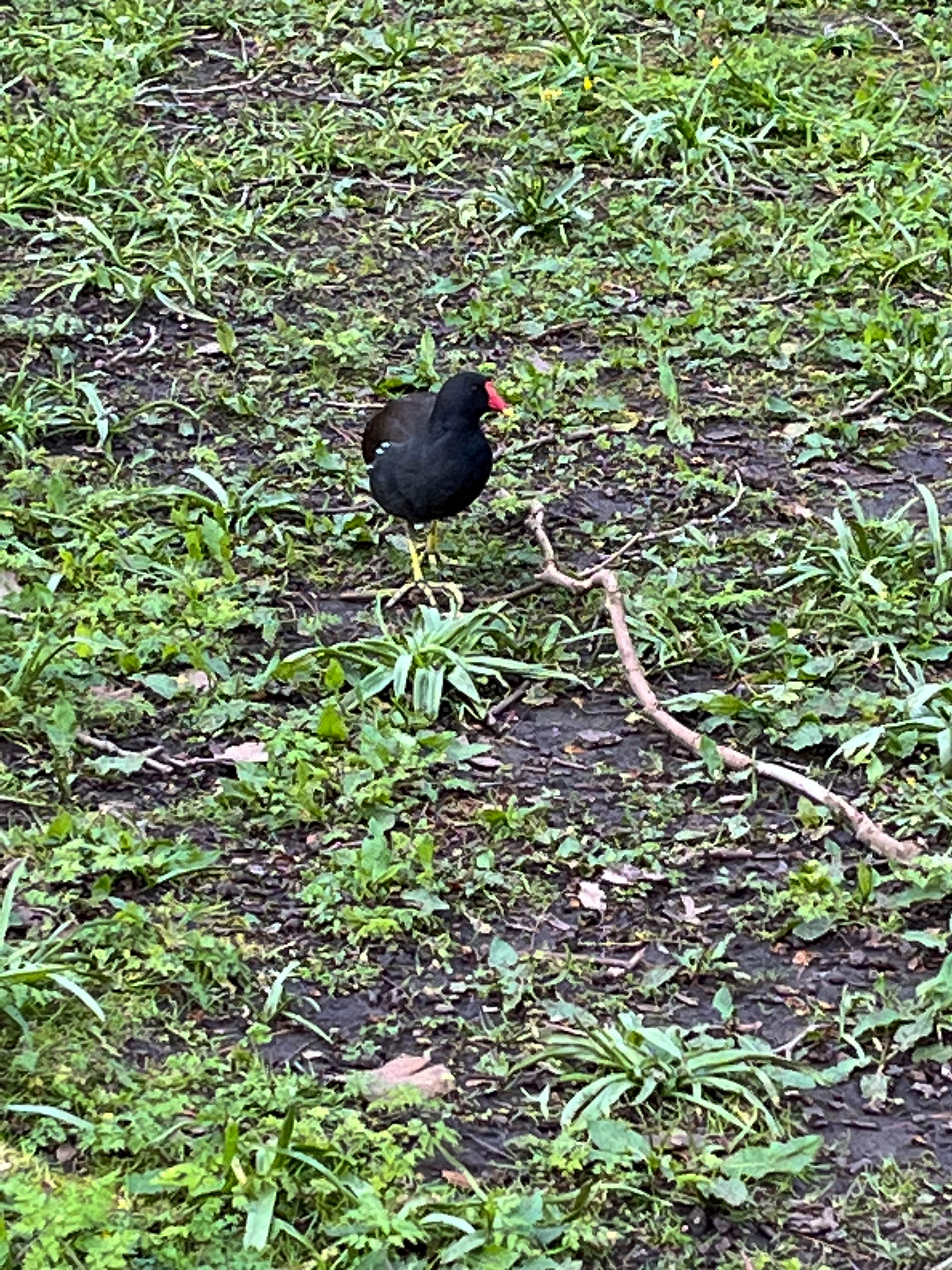 At this point, it clouded over and the temperature dropped a couple of degrees and so no more activity was noted on the way back around the south side of the Tarn, except walking along a path through the trees I came face to face with a Moorhen coming towards me. I stopped, and he stopped. I looked at him; he looked at me. Not wishing to spook him I moved off to the side and began to move around him. He kept a good watch on me as I passed and then when he was happy I wasn’t a threat continued his saunter down the path.