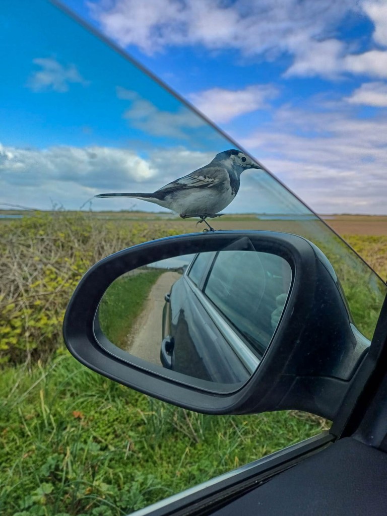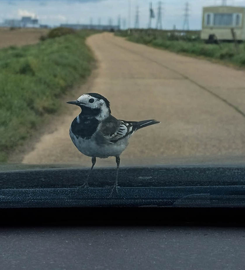 On our trip to Dungeness last Wednesday, we had an amazing encounter with a Pied Wagtail. As we were driving along it landed on the car and proceeded to stay there as we continued to drive, albeit very slowly. It seemed very interested in the area around the windscreen wipers and we were unsure if it was after food or could just see its reflection in the bonnet. Occasionally it would fly off but would soon be back often perching first on the wing mirror before moving back to the bonnet. Eventually, it flew off and landed on the road.