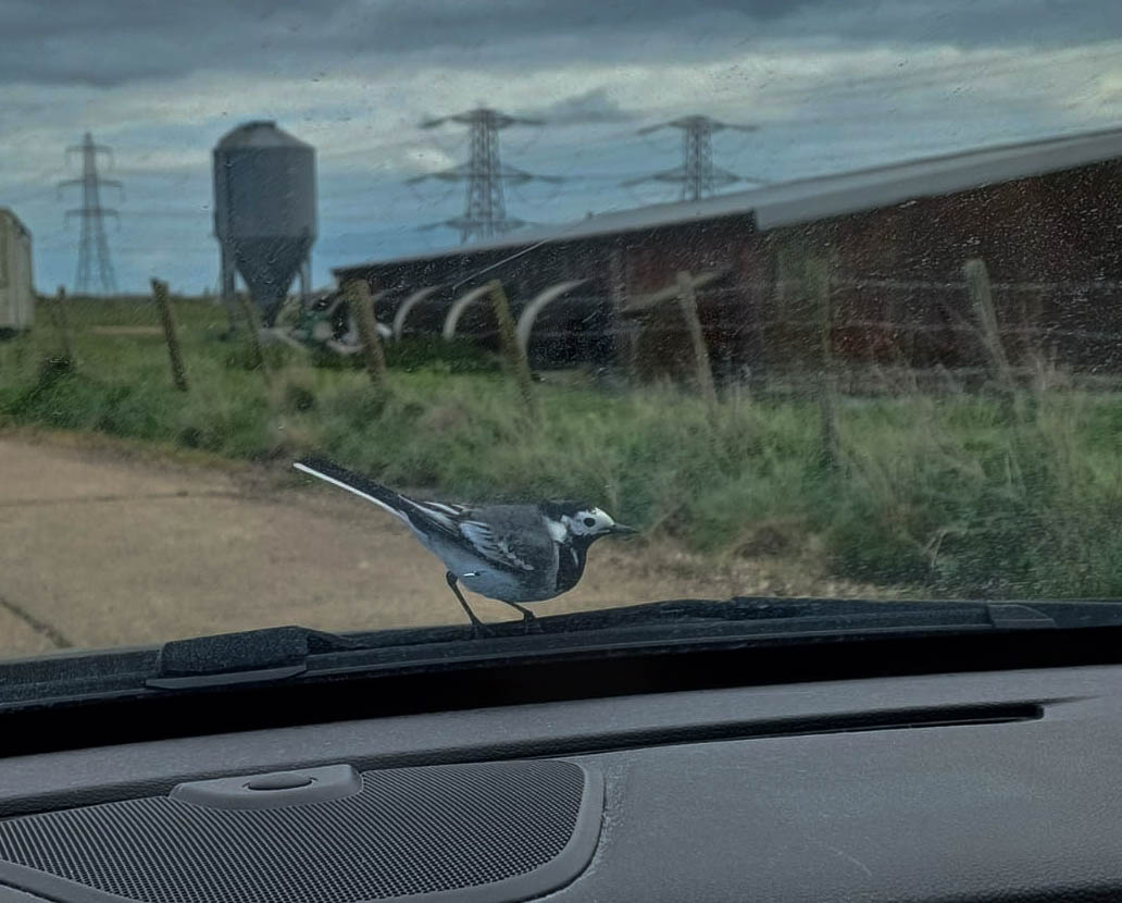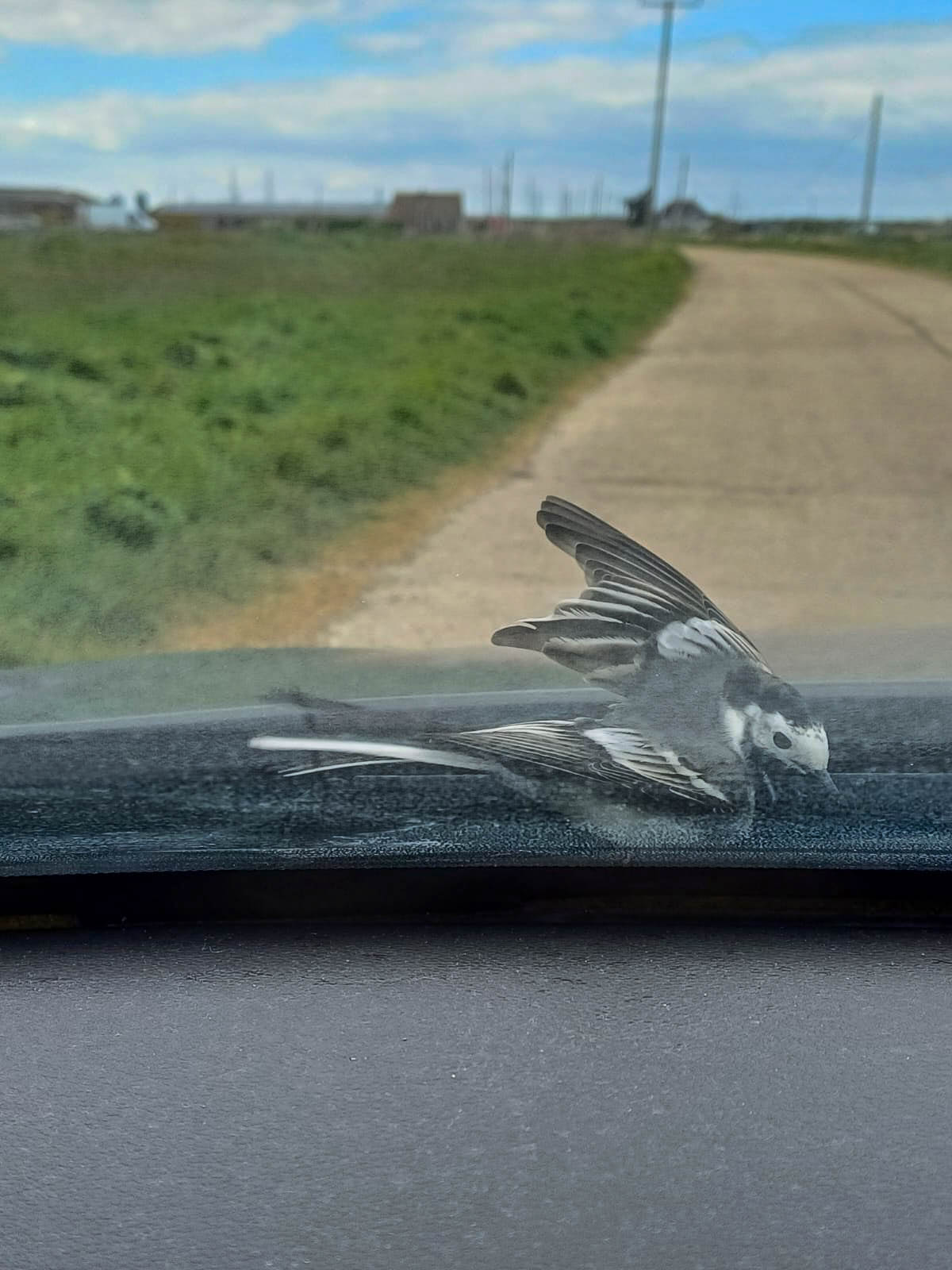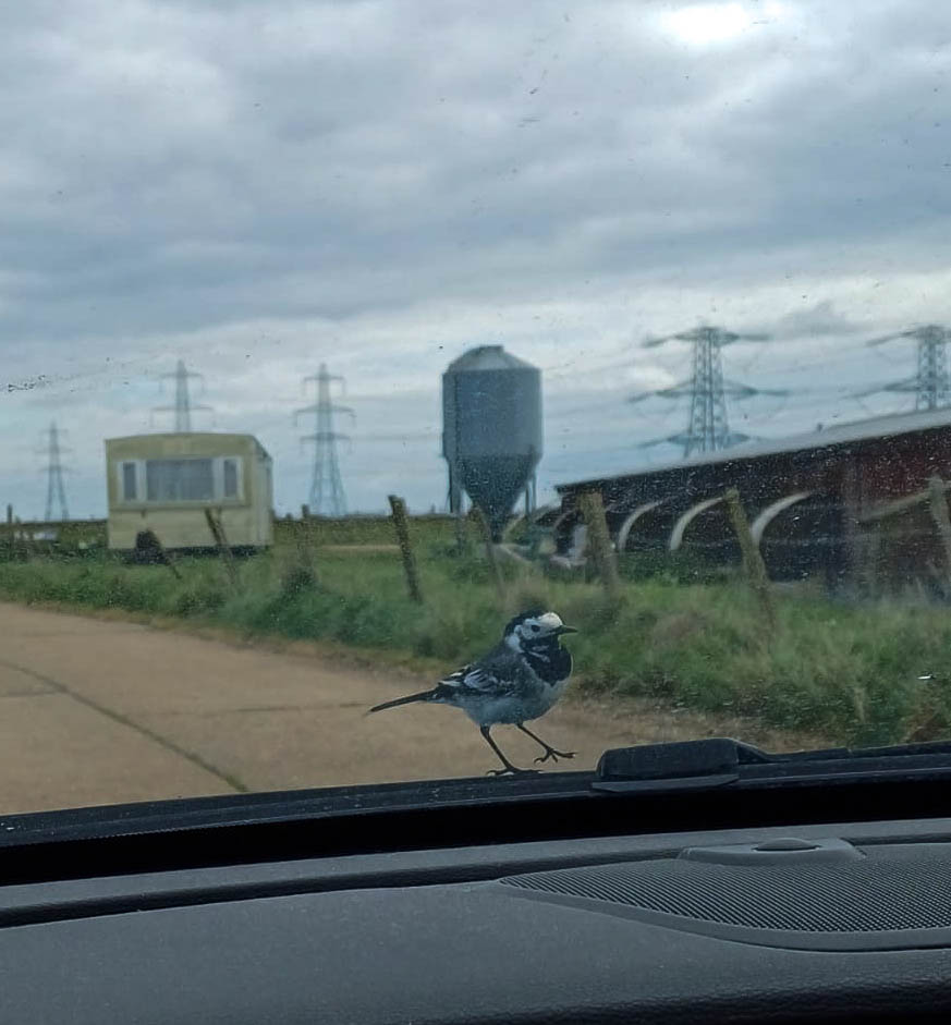 On our trip to Dungeness last Wednesday, we had an amazing encounter with a Pied Wagtail. As we were driving along it landed on the car and proceeded to stay there as we continued to drive, albeit very slowly. It seemed very interested in the area around the windscreen wipers and we were unsure if it was after food or could just see its reflection in the bonnet. Occasionally it would fly off but would soon be back often perching first on the wing mirror before moving back to the bonnet. Eventually, it flew off and landed on the road.