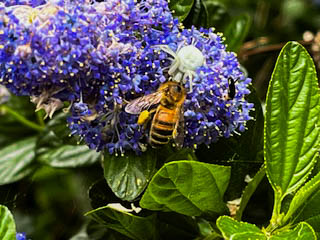 When I was doing my local patch walk last week, I noticed a Bee behaving rather strangely, so I took a photograph of it. When I looked at the photo later I could see why as it was being held by a Crab Spider. Despite being white on a blue flower, I just hadn’t seen the spider when watching in the field.