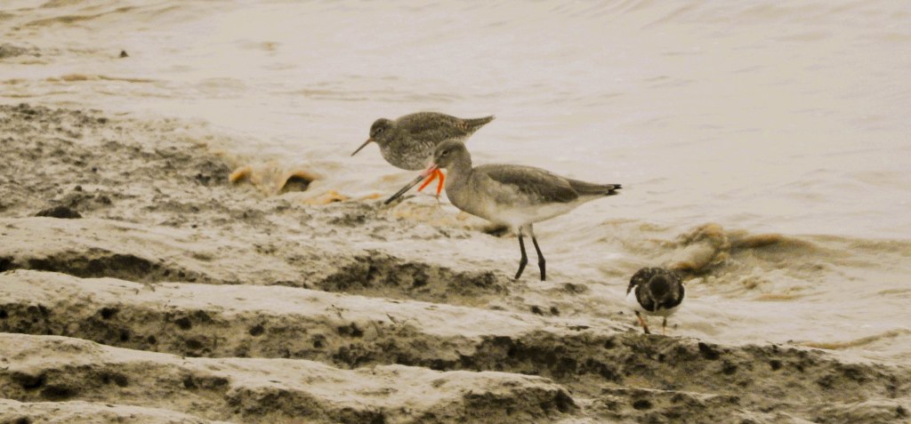 By now there was plenty of mud exposed and we saw Shelduck, Redshank, Black-tailed Godwit, Curlew and Dunlin along with Black-headed, Common and Herring Gulls. A Cormorant and a Grey Heron perched on the jetty and Pied and Grey Wagtails flitted about on the beach.
