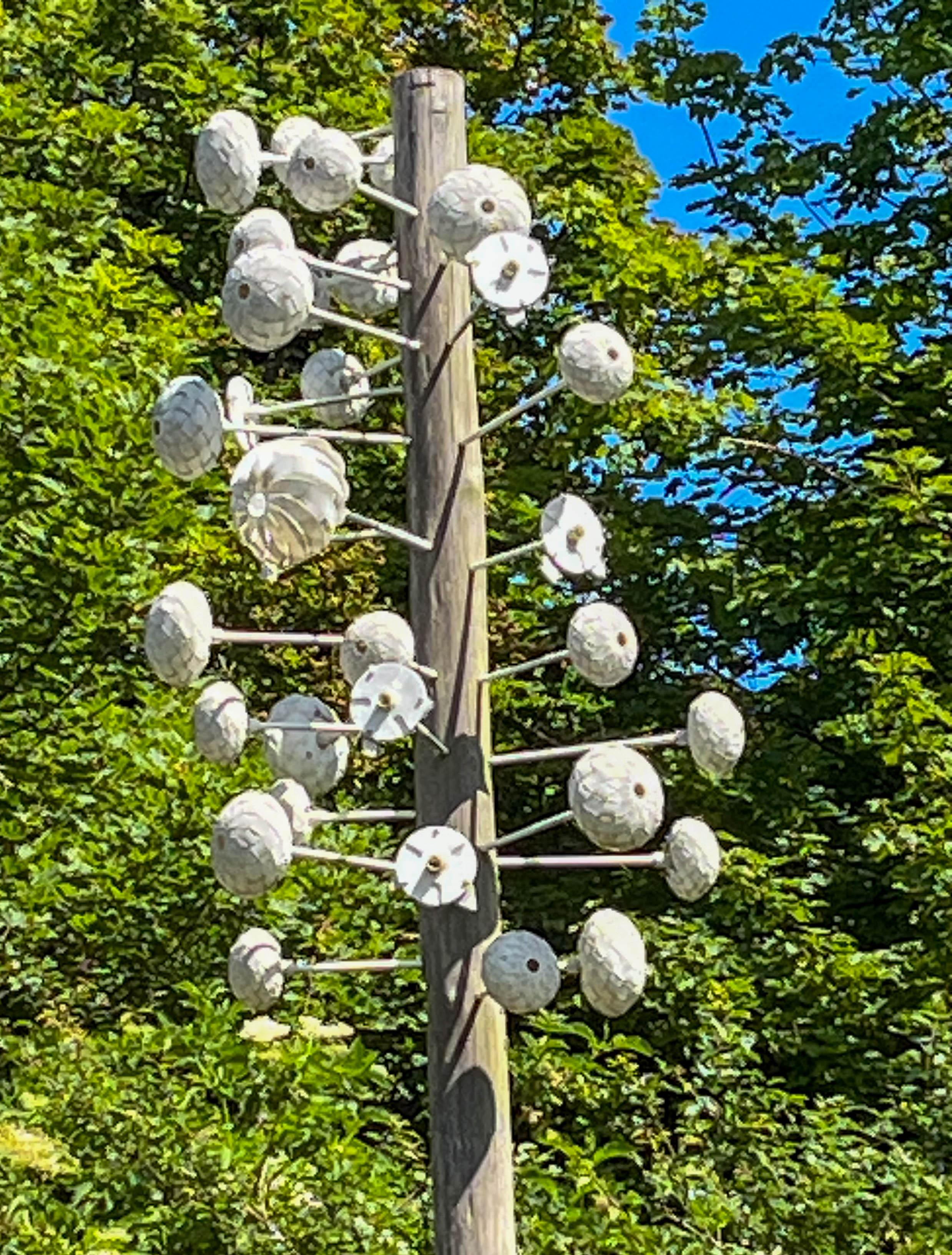 This sculpture is one of a series erected in 2019 to mark the opening of the IKEA store in Greenwich and celebrating the stores green credentials. It is by Beep studios and has turned IKEA’s Strala lamps into bird nesting pods