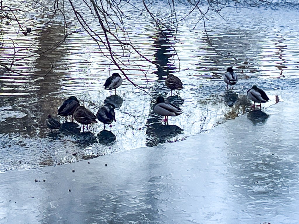 The western end was frozen except around the water pump and the birds congregated on the ice. The wintering drake Teal was with a group of mallard and a Grey Wagtail fed along the frozen margins.