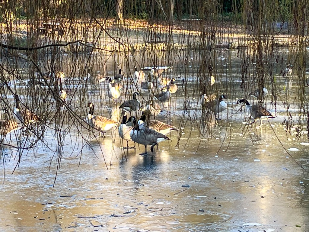 About a third of the Tarn remained unfrozen and groups of birds were swimming feely here.