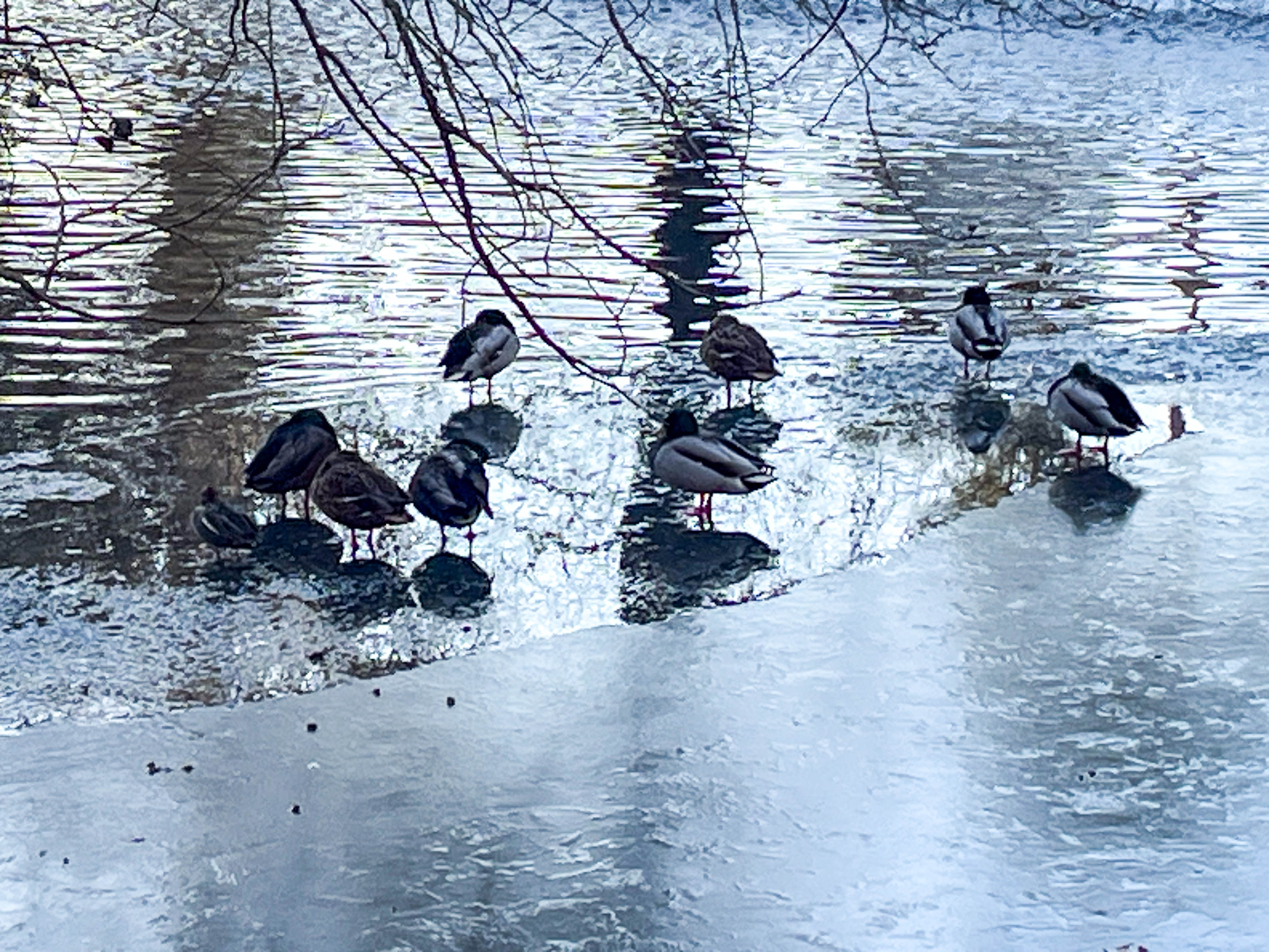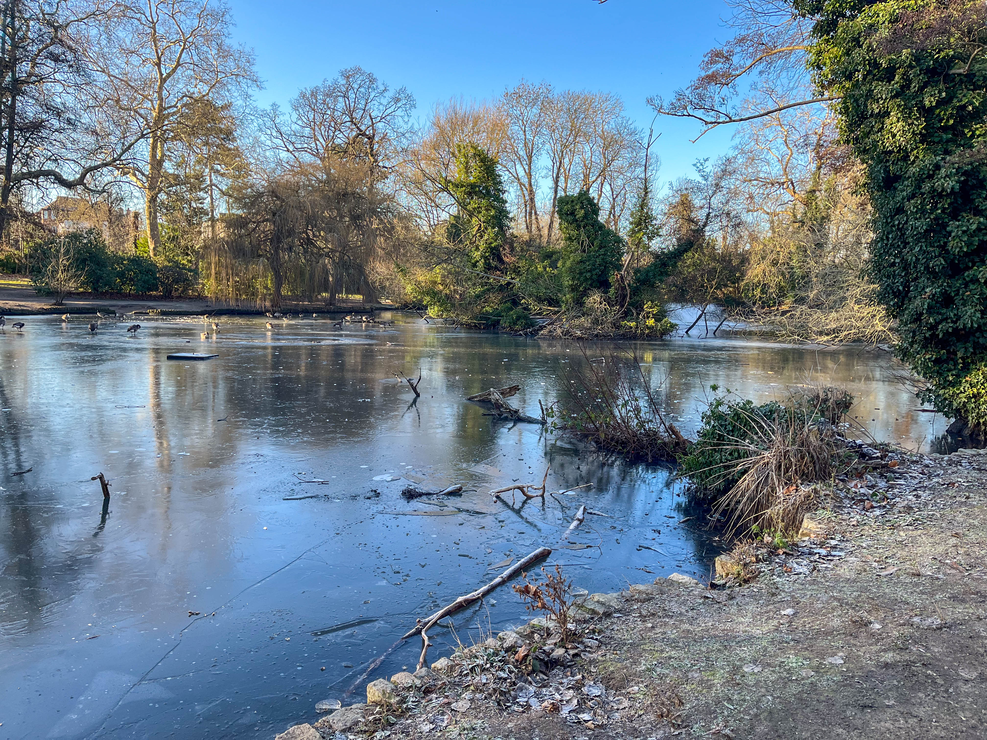 About a third of the Tarn remained unfrozen and groups of birds were swimming feely here.